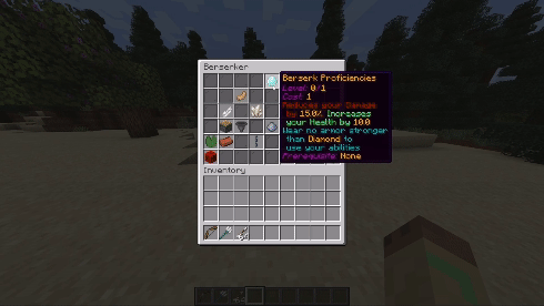 Each class has its own skill tree. When a player levels up through the custom levelling system, they gain a class point to spend at even levels, and a profession point at odd levels.